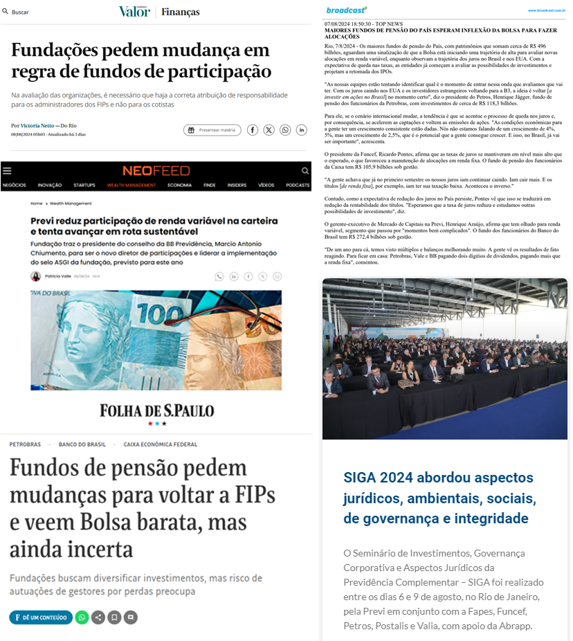 Organizado pela Previ junto com Petros, Funcef, Valia, Fapes e Postalis, o SIGA teve cobertura da imprensa, com matérias sobre o evento divulgadas em diversos veículos de comunicação, como o Valor Econômico, Estadão, Folha de S. Paulo, UOL, InfoMoney, NeoFeed e Blog da Abrapp.